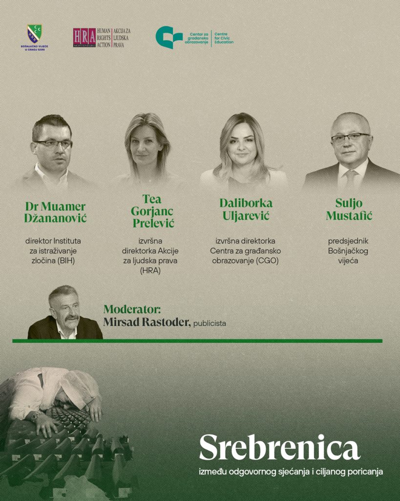 U ugodnom okruženju Velike sale Centra za građansko obrazovanje (CGO) u Podgorici, 5. jula 2025. godine, s početkom u 19:30h, bit će održana memorijalna tribina pod nazivom “Srebrenica između odgovornog sjećanja i ciljanog poricanja”. Organizatori ovog događaja su CGO, Bošnjačko vijeće u Crnoj Gori i Akcija za ljudska prava (HRA), a sve ovo u susret 30. godišnjici genocida u Srebrenici. Diskusija će se fokusirati na značaju odgovornog sjećanja i njegov doprinos društvu, ali isto tako i na mehanizme, motive i posljedice poricanja genocida. U okviru ovog događaja, biće otvorena pitanja o tome kako se danas oblikuje narativ o Srebrenici, te kakvu ulogu imaju politika, obrazovanje i mediji u čuvanju istine ili njenom iskrivljavanju. Ukupno četiri govornika će prenijeti svoje misli i stavove, dok će tribinu moderirati publicista Mirsad Rastoder.